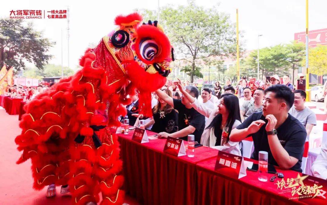祥獅蘇醒,煥發出勃勃生機,必將為大將軍帶來滾滾財源。雄獅在點睛后神采奕奕,接下來,是傳統的醒獅點睛采青儀式。采青寓意為生意興隆,生菜寓“生財”之意,生菜落地,“落地生財” ,愿騰飛的祥獅能為大將軍瓷磚摘得好彩頭,能讓大將軍瓷磚蒸蒸日上、財源滾滾。