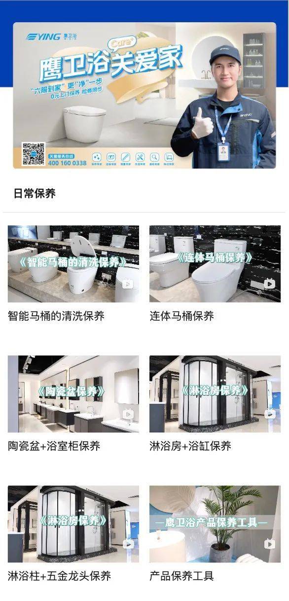 關注“鷹衛浴”公眾號,在公眾號【服務】子欄目,即可進入「CARE+關愛家」售后服務中心