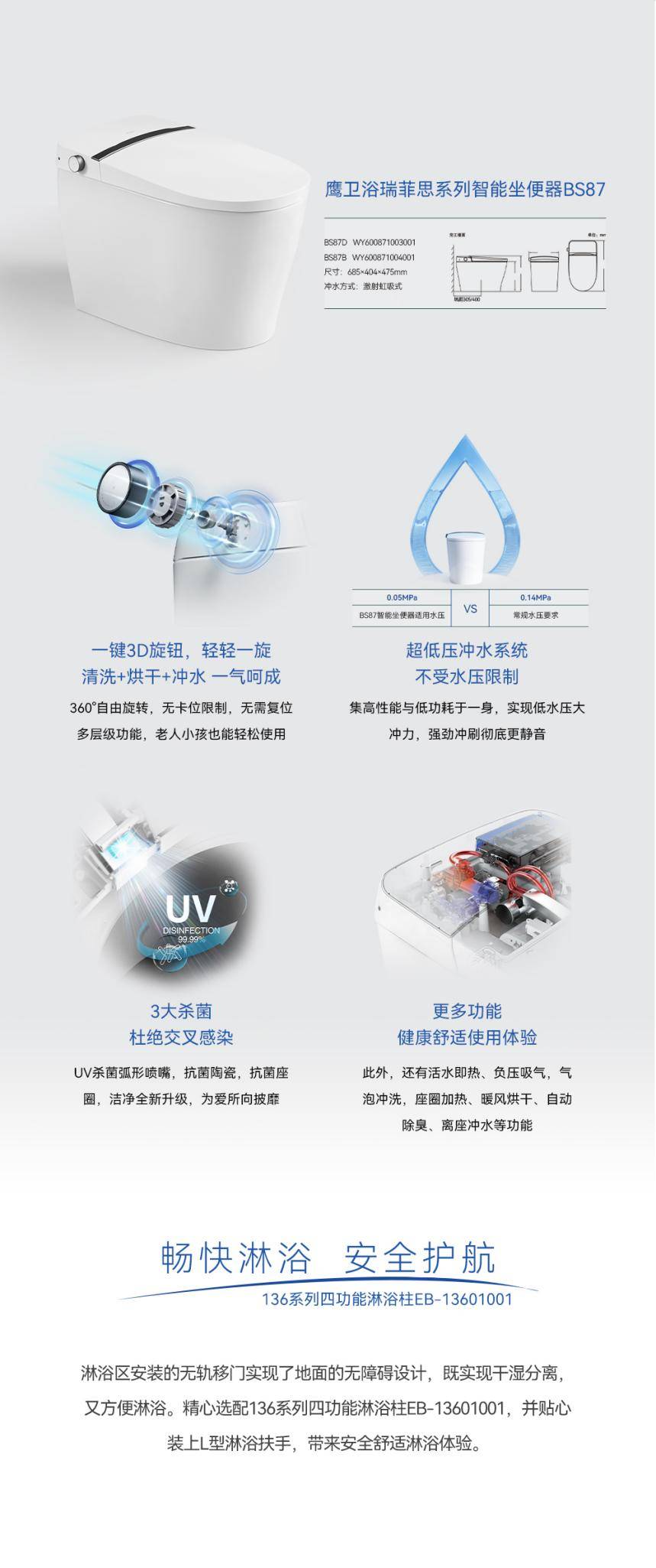 智能化衛浴在適老化改造中起到越來越重要的作用。比起傳統馬桶,智能坐便器,擁有座圈加熱、健康水洗、暖風干燥、除菌抗菌等,更適用于老年人的使用。鷹衛浴瑞菲思系列智能坐便器BS87,擁有人性化的設計,全面的智能功能,健康水洗體驗,便捷的遙控操作,讓“養老”變“享老”。