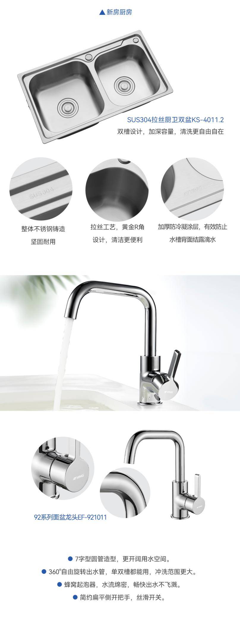 新房廚房寬敞明亮,設備齊全,搭配鷹衛浴SUS304拉絲廚衛雙盆KS-4011.2和92系列面盆龍頭EF-921011,暢享廚房樂趣。