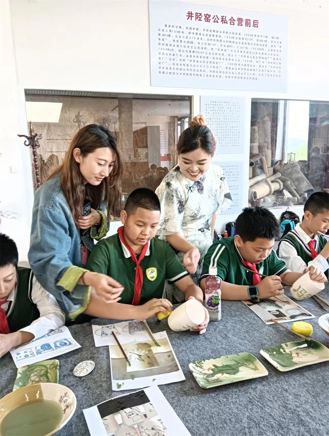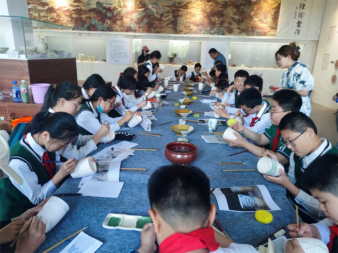 在活動開始之前,同學們先認真完成了陶藝王老師布置的前參作業,對井陘窯資料收集、學習,帶著問題和思考去活動。在井陘窯工作人員的帶領和全程指導下,同學們聽講座+參觀+親自動手體驗學習、結合在學校陶藝課上所學的知識,同學們對陶瓷藝術更加著迷,多方位一體,深度研學,通過實物標本,同學們看到古代制瓷工匠,在選料、淘練、拉坯、修坯、配釉、施釉、裝飾、匣缽、燒裝、狀態和燒成等,可以清晰得看見瓷器燒造的全流程。同學們在參觀中學,在動手中領悟,零距離感受手藝人的匠心。在動手體驗實踐環節,同學們興致勃勃,沉浸式體驗釉下彩繪和拉坯陶藝技法,惟妙惟肖、栩栩如生的一個個作品在同學們手中誕生了,
