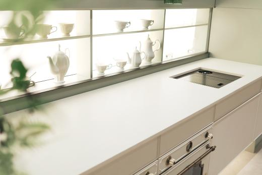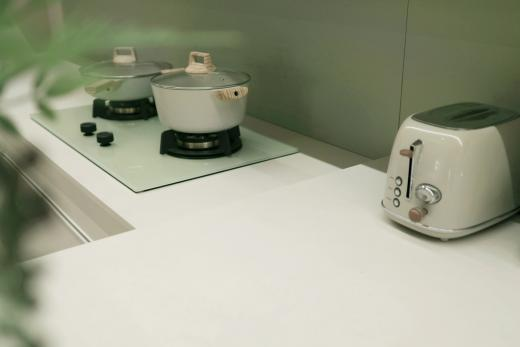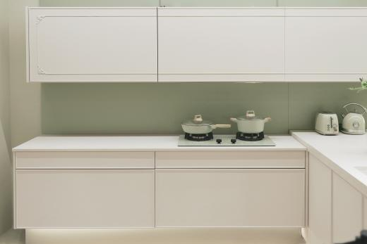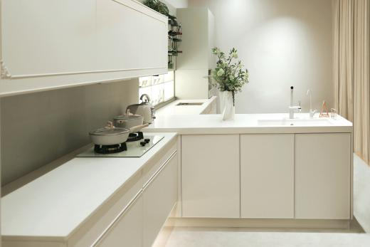 一抹奶油色調的溫柔鋪陳,選取石英石國色系列為廚房場域增添淡雅和煦的氛圍,帶來藝術美感,在天氣明媚的日子,陽光便能穿過窗框在廚房落腳,增加烹飪的舒心感與用餐的愉悅感。