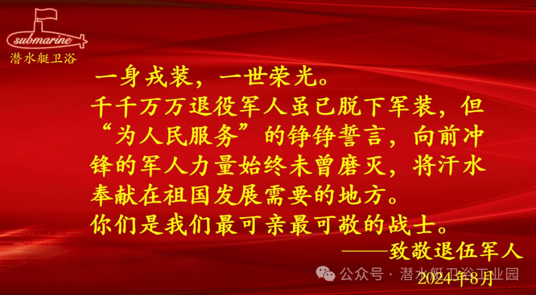 昔日,他們是保衛(wèi)家國的人民子弟兵。今朝,脫下軍裝的他們,成為了愛崗敬業(yè)的潛水艇衛(wèi)浴工作者。崗位上,他們始終保持著軍隊培養(yǎng)出來的血性、品德和素質(zhì)。他們用堅韌的意志、拼搏的精神詮釋著,退伍不褪色、退役不退志!八一前夕江蘇潤凡科技有限公司為退伍軍人舉行慶祝活動彭書記在活動中致辭潛水艇最可愛的人彭書記為六位退伍軍人頒發(fā)紀念品一身戎裝,一世榮光。他們曾用綠色